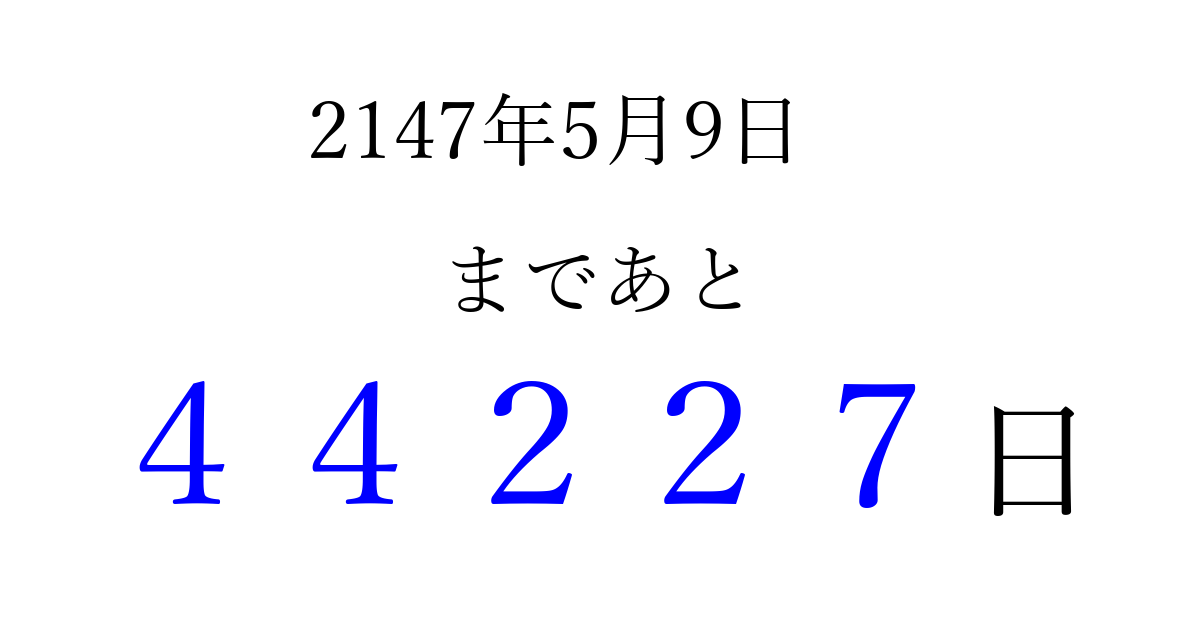 2147年5月9日(火)まで あと 99999 日です 追加すると、トップページからすぐ選べるようになります ※2026/04/06現在の結果です。 最新の状態に更新する ↓シェアして、タイムライン上にカウントダウンを表示しよう!↓ 📤 この結果を共有する Tweet シェア Threads Bluesky 別の日付でカウントダウン 2147年5月のカレンダー このページをブックマークに追加すると、いつでもカウントダウンを確認できます。 (PC: Ctrl+D / Mac: ⌘+D) hitome-notes.comでは以下のページも運営しています。 指定日と期間から日付を計算 | ガチャ確率計算・シミュレーション | プライバシー・ポリシー 運営者:Avocado