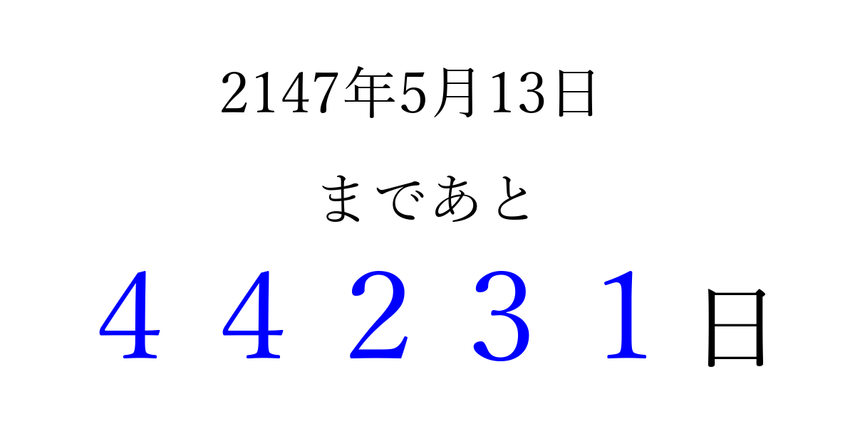 2147年5月13日(土)まで あと 99999 日です 追加すると、トップページからすぐ選べるようになります ※2026/04/06現在の結果です。 最新の状態に更新する ↓シェアして、タイムライン上にカウントダウンを表示しよう!↓ 📤 この結果を共有する Tweet シェア Threads Bluesky 別の日付でカウントダウン 2147年5月のカレンダー このページをブックマークに追加すると、いつでもカウントダウンを確認できます。 (PC: Ctrl+D / Mac: ⌘+D) hitome-notes.comでは以下のページも運営しています。 指定日と期間から日付を計算 | ガチャ確率計算・シミュレーション | プライバシー・ポリシー 運営者:Avocado