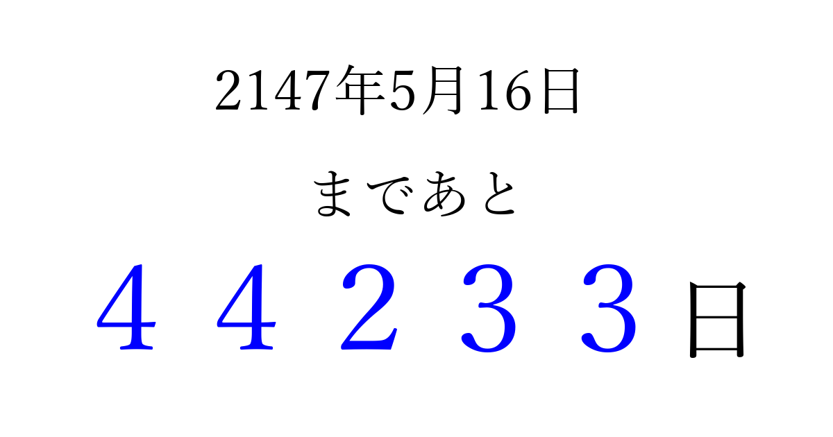 2147年5月16日(火)まで あと 99999 日です 追加すると、トップページからすぐ選べるようになります ※2026/04/07現在の結果です。 最新の状態に更新する ↓シェアして、タイムライン上にカウントダウンを表示しよう!↓ 📤 この結果を共有する Tweet シェア Threads Bluesky 別の日付でカウントダウン 2147年5月のカレンダー このページをブックマークに追加すると、いつでもカウントダウンを確認できます。 (PC: Ctrl+D / Mac: ⌘+D) hitome-notes.comでは以下のページも運営しています。 指定日と期間から日付を計算 | ガチャ確率計算・シミュレーション | プライバシー・ポリシー 運営者:Avocado