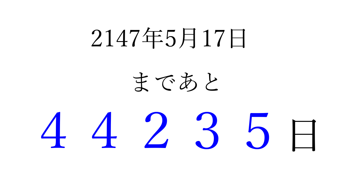 2147年5月17日(水)まで あと 99999 日です 追加すると、トップページからすぐ選べるようになります ※2026/04/06現在の結果です。 最新の状態に更新する ↓シェアして、タイムライン上にカウントダウンを表示しよう!↓ 📤 この結果を共有する Tweet シェア Threads Bluesky 別の日付でカウントダウン 2147年5月のカレンダー このページをブックマークに追加すると、いつでもカウントダウンを確認できます。 (PC: Ctrl+D / Mac: ⌘+D) hitome-notes.comでは以下のページも運営しています。 指定日と期間から日付を計算 | ガチャ確率計算・シミュレーション | プライバシー・ポリシー 運営者:Avocado