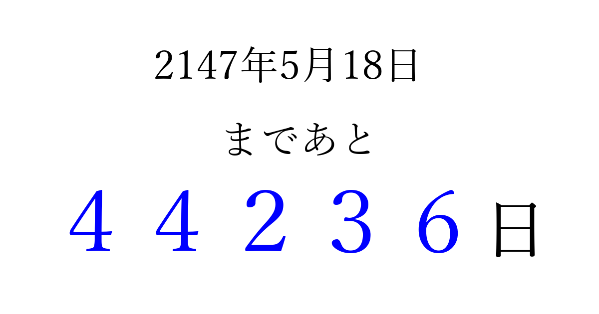 2147年5月18日(木)まで あと 99999 日です 追加すると、トップページからすぐ選べるようになります ※2026/04/06現在の結果です。 最新の状態に更新する ↓シェアして、タイムライン上にカウントダウンを表示しよう!↓ 📤 この結果を共有する Tweet シェア Threads Bluesky 別の日付でカウントダウン 2147年5月のカレンダー このページをブックマークに追加すると、いつでもカウントダウンを確認できます。 (PC: Ctrl+D / Mac: ⌘+D) hitome-notes.comでは以下のページも運営しています。 指定日と期間から日付を計算 | ガチャ確率計算・シミュレーション | プライバシー・ポリシー 運営者:Avocado