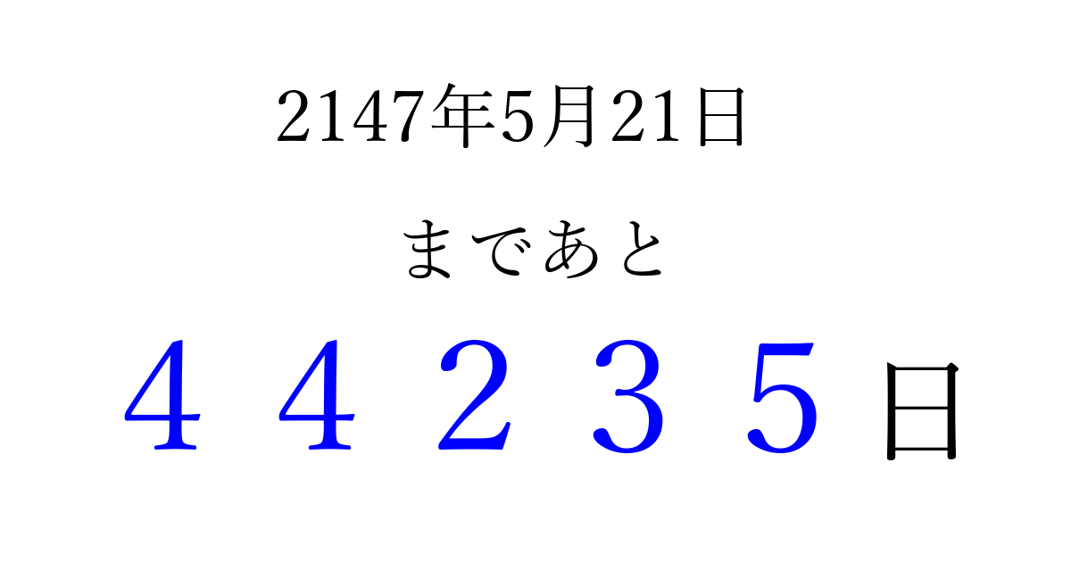 2147年5月21日(日)まで あと 99999 日です 追加すると、トップページからすぐ選べるようになります ※2026/04/10現在の結果です。 最新の状態に更新する ↓シェアして、タイムライン上にカウントダウンを表示しよう!↓ 📤 この結果を共有する Tweet シェア Threads Bluesky 別の日付でカウントダウン 2147年5月のカレンダー このページをブックマークに追加すると、いつでもカウントダウンを確認できます。 (PC: Ctrl+D / Mac: ⌘+D) hitome-notes.comでは以下のページも運営しています。 指定日と期間から日付を計算 | ガチャ確率計算・シミュレーション | プライバシー・ポリシー 運営者:Avocado