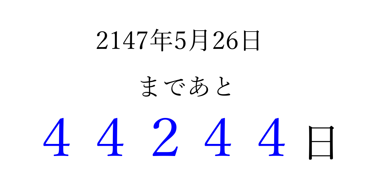 2147年5月26日(金)まで あと 99999 日です 追加すると、トップページからすぐ選べるようになります ※2026/04/06現在の結果です。 最新の状態に更新する ↓シェアして、タイムライン上にカウントダウンを表示しよう!↓ 📤 この結果を共有する Tweet シェア Threads Bluesky 別の日付でカウントダウン 2147年5月のカレンダー このページをブックマークに追加すると、いつでもカウントダウンを確認できます。 (PC: Ctrl+D / Mac: ⌘+D) hitome-notes.comでは以下のページも運営しています。 指定日と期間から日付を計算 | ガチャ確率計算・シミュレーション | プライバシー・ポリシー 運営者:Avocado