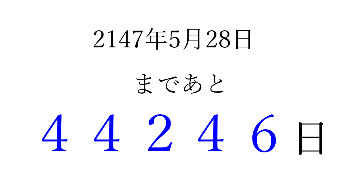 2147年5月28日(日)まで あと 99999 日です 追加すると、トップページからすぐ選べるようになります ※2026/04/06現在の結果です。 最新の状態に更新する ↓シェアして、タイムライン上にカウントダウンを表示しよう!↓ 📤 この結果を共有する Tweet シェア Threads Bluesky 別の日付でカウントダウン 2147年5月のカレンダー このページをブックマークに追加すると、いつでもカウントダウンを確認できます。 (PC: Ctrl+D / Mac: ⌘+D) hitome-notes.comでは以下のページも運営しています。 指定日と期間から日付を計算 | ガチャ確率計算・シミュレーション | プライバシー・ポリシー 運営者:Avocado