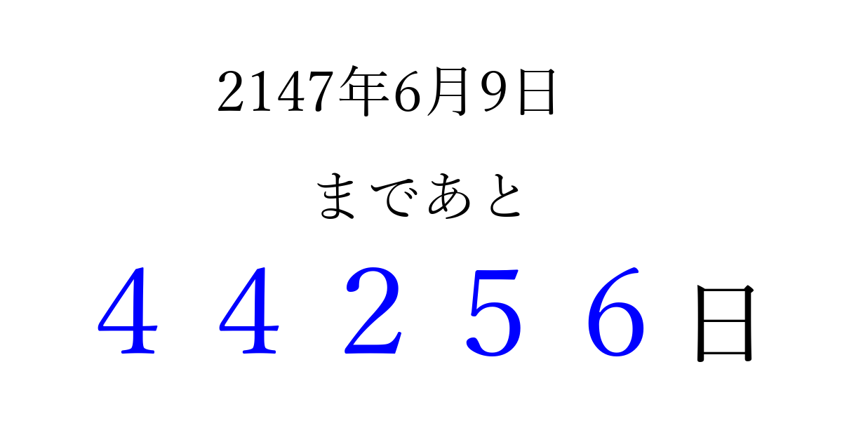 2147年6月9日(金)まで あと 99999 日です 追加すると、トップページからすぐ選べるようになります ※2026/04/08現在の結果です。 最新の状態に更新する ↓シェアして、タイムライン上にカウントダウンを表示しよう!↓ 📤 この結果を共有する Tweet シェア Threads Bluesky 別の日付でカウントダウン 2147年6月のカレンダー このページをブックマークに追加すると、いつでもカウントダウンを確認できます。 (PC: Ctrl+D / Mac: ⌘+D) hitome-notes.comでは以下のページも運営しています。 指定日と期間から日付を計算 | ガチャ確率計算・シミュレーション | プライバシー・ポリシー 運営者:Avocado