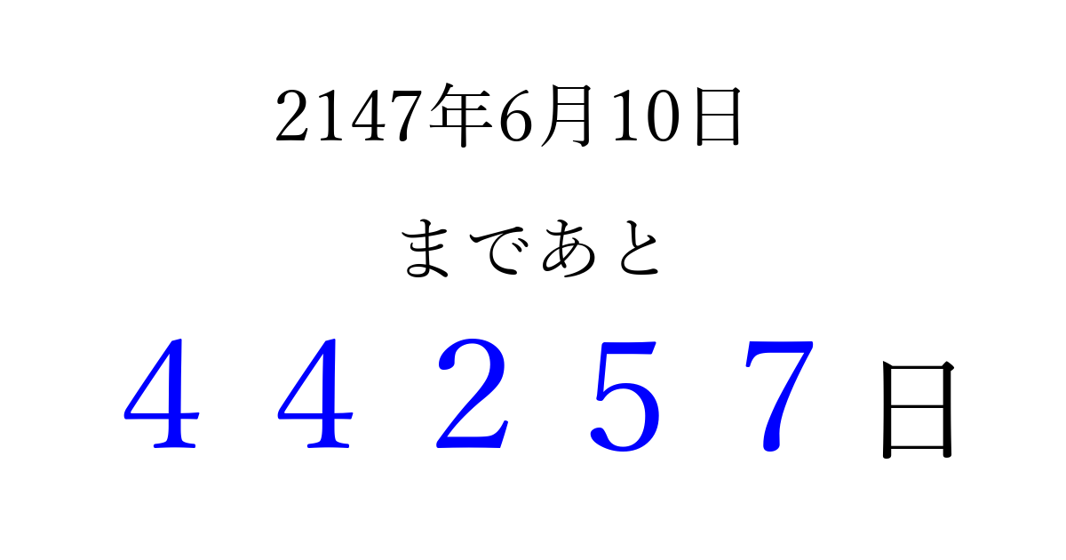 2147年6月10日(土)まで あと 99999 日です 追加すると、トップページからすぐ選べるようになります ※2026/04/08現在の結果です。 最新の状態に更新する ↓シェアして、タイムライン上にカウントダウンを表示しよう!↓ 📤 この結果を共有する Tweet シェア Threads Bluesky 別の日付でカウントダウン 2147年6月のカレンダー このページをブックマークに追加すると、いつでもカウントダウンを確認できます。 (PC: Ctrl+D / Mac: ⌘+D) hitome-notes.comでは以下のページも運営しています。 指定日と期間から日付を計算 | ガチャ確率計算・シミュレーション | プライバシー・ポリシー 運営者:Avocado