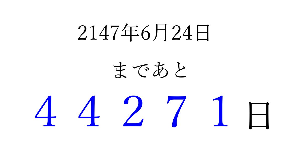 2147年6月24日(土)まで あと 99999 日です 追加すると、トップページからすぐ選べるようになります ※2026/04/08現在の結果です。 最新の状態に更新する ↓シェアして、タイムライン上にカウントダウンを表示しよう!↓ 📤 この結果を共有する Tweet シェア Threads Bluesky 別の日付でカウントダウン 2147年6月のカレンダー このページをブックマークに追加すると、いつでもカウントダウンを確認できます。 (PC: Ctrl+D / Mac: ⌘+D) hitome-notes.comでは以下のページも運営しています。 指定日と期間から日付を計算 | ガチャ確率計算・シミュレーション | プライバシー・ポリシー 運営者:Avocado