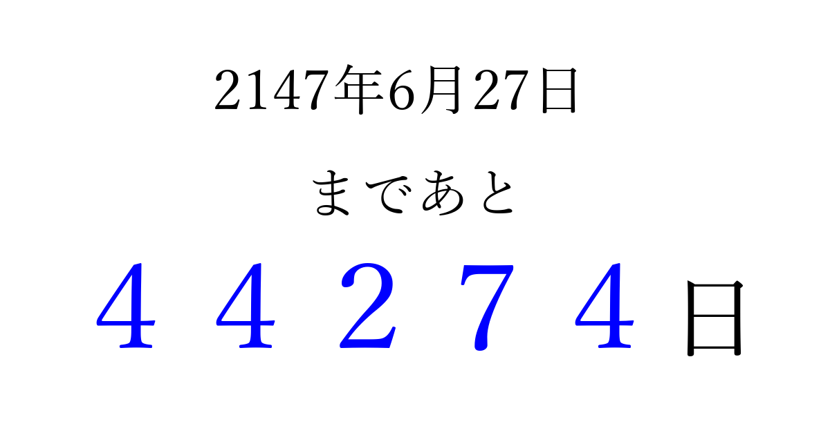 2147年6月27日(火)まで あと 99999 日です 追加すると、トップページからすぐ選べるようになります ※2026/04/08現在の結果です。 最新の状態に更新する ↓シェアして、タイムライン上にカウントダウンを表示しよう!↓ 📤 この結果を共有する Tweet シェア Threads Bluesky 別の日付でカウントダウン 2147年6月のカレンダー このページをブックマークに追加すると、いつでもカウントダウンを確認できます。 (PC: Ctrl+D / Mac: ⌘+D) hitome-notes.comでは以下のページも運営しています。 指定日と期間から日付を計算 | ガチャ確率計算・シミュレーション | プライバシー・ポリシー 運営者:Avocado