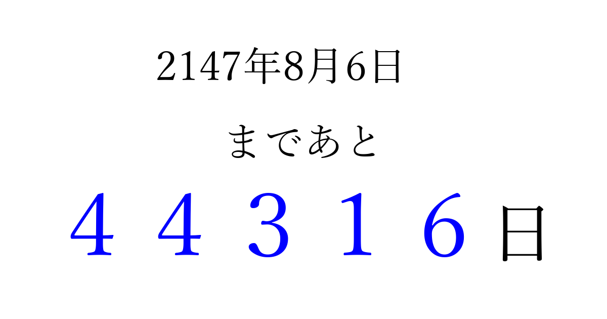 2147年8月6日(日)まで あと 99999 日です 追加すると、トップページからすぐ選べるようになります ※2026/04/06現在の結果です。 最新の状態に更新する ↓シェアして、タイムライン上にカウントダウンを表示しよう!↓ 📤 この結果を共有する Tweet シェア Threads Bluesky 別の日付でカウントダウン 2147年8月のカレンダー このページをブックマークに追加すると、いつでもカウントダウンを確認できます。 (PC: Ctrl+D / Mac: ⌘+D) hitome-notes.comでは以下のページも運営しています。 指定日と期間から日付を計算 | ガチャ確率計算・シミュレーション | プライバシー・ポリシー 運営者:Avocado