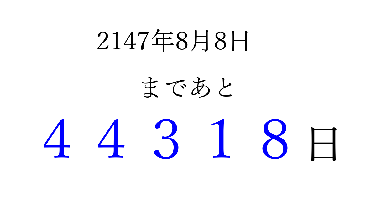 2147年8月8日(火)まで あと 99999 日です 追加すると、トップページからすぐ選べるようになります ※2026/04/06現在の結果です。 最新の状態に更新する ↓シェアして、タイムライン上にカウントダウンを表示しよう!↓ 📤 この結果を共有する Tweet シェア Threads Bluesky 別の日付でカウントダウン 2147年8月のカレンダー このページをブックマークに追加すると、いつでもカウントダウンを確認できます。 (PC: Ctrl+D / Mac: ⌘+D) hitome-notes.comでは以下のページも運営しています。 指定日と期間から日付を計算 | ガチャ確率計算・シミュレーション | プライバシー・ポリシー 運営者:Avocado