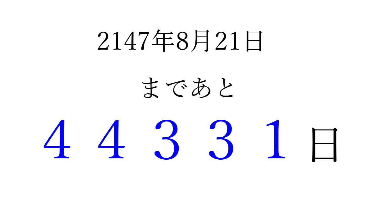 2147年8月21日(月)まで あと 99999 日です 追加すると、トップページからすぐ選べるようになります ※2026/04/06現在の結果です。 最新の状態に更新する ↓シェアして、タイムライン上にカウントダウンを表示しよう!↓ 📤 この結果を共有する Tweet シェア Threads Bluesky 別の日付でカウントダウン 2147年8月のカレンダー このページをブックマークに追加すると、いつでもカウントダウンを確認できます。 (PC: Ctrl+D / Mac: ⌘+D) hitome-notes.comでは以下のページも運営しています。 指定日と期間から日付を計算 | ガチャ確率計算・シミュレーション | プライバシー・ポリシー 運営者:Avocado