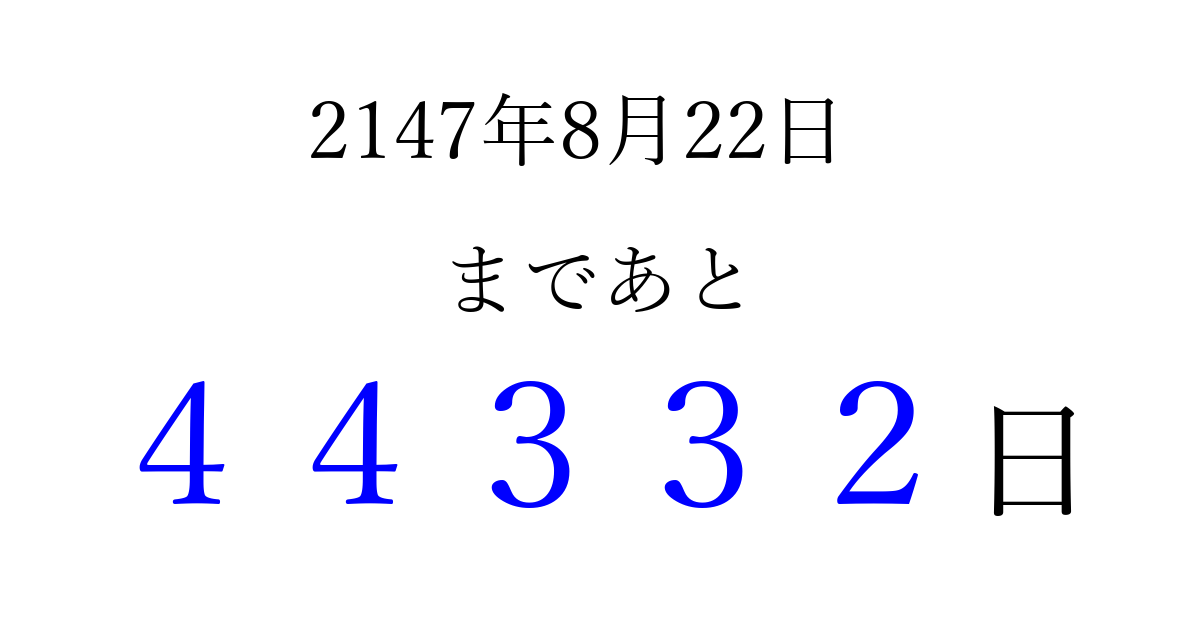2147年8月22日(火)まで あと 99999 日です 追加すると、トップページからすぐ選べるようになります ※2026/04/06現在の結果です。 最新の状態に更新する ↓シェアして、タイムライン上にカウントダウンを表示しよう!↓ 📤 この結果を共有する Tweet シェア Threads Bluesky 別の日付でカウントダウン 2147年8月のカレンダー このページをブックマークに追加すると、いつでもカウントダウンを確認できます。 (PC: Ctrl+D / Mac: ⌘+D) hitome-notes.comでは以下のページも運営しています。 指定日と期間から日付を計算 | ガチャ確率計算・シミュレーション | プライバシー・ポリシー 運営者:Avocado