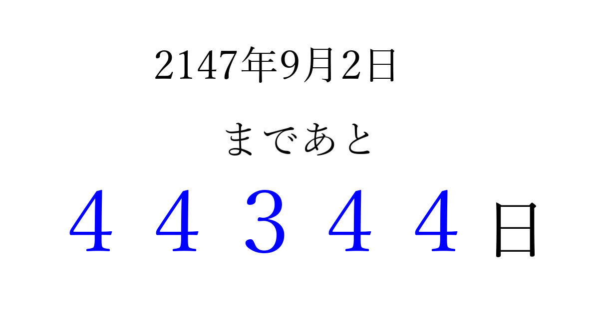 2147年9月2日(土)まで あと 99999 日です 追加すると、トップページからすぐ選べるようになります ※2026/04/05現在の結果です。 最新の状態に更新する ↓シェアして、タイムライン上にカウントダウンを表示しよう!↓ 📤 この結果を共有する Tweet シェア Threads Bluesky 別の日付でカウントダウン 2147年9月のカレンダー このページをブックマークに追加すると、いつでもカウントダウンを確認できます。 (PC: Ctrl+D / Mac: ⌘+D) hitome-notes.comでは以下のページも運営しています。 指定日と期間から日付を計算 | ガチャ確率計算・シミュレーション | プライバシー・ポリシー 運営者:Avocado