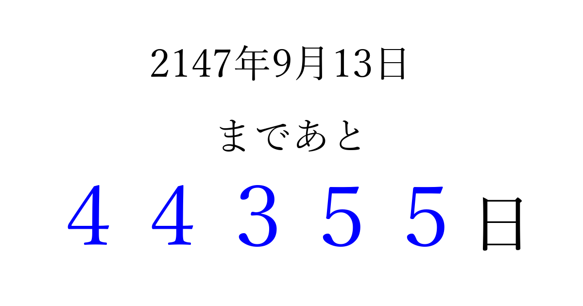 2147年9月13日(水)まで あと 99999 日です 追加すると、トップページからすぐ選べるようになります ※2026/04/05現在の結果です。 最新の状態に更新する ↓シェアして、タイムライン上にカウントダウンを表示しよう!↓ 📤 この結果を共有する Tweet シェア Threads Bluesky 別の日付でカウントダウン 2147年9月のカレンダー このページをブックマークに追加すると、いつでもカウントダウンを確認できます。 (PC: Ctrl+D / Mac: ⌘+D) hitome-notes.comでは以下のページも運営しています。 指定日と期間から日付を計算 | ガチャ確率計算・シミュレーション | プライバシー・ポリシー 運営者:Avocado