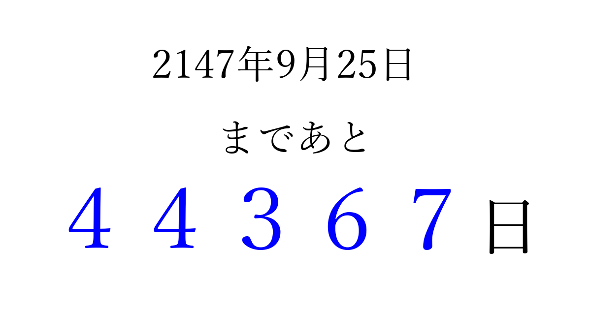 2147年9月25日(月)まで あと 99999 日です 追加すると、トップページからすぐ選べるようになります ※2026/04/05現在の結果です。 最新の状態に更新する ↓シェアして、タイムライン上にカウントダウンを表示しよう!↓ 📤 この結果を共有する Tweet シェア Threads Bluesky 別の日付でカウントダウン 2147年9月のカレンダー このページをブックマークに追加すると、いつでもカウントダウンを確認できます。 (PC: Ctrl+D / Mac: ⌘+D) hitome-notes.comでは以下のページも運営しています。 指定日と期間から日付を計算 | ガチャ確率計算・シミュレーション | プライバシー・ポリシー 運営者:Avocado