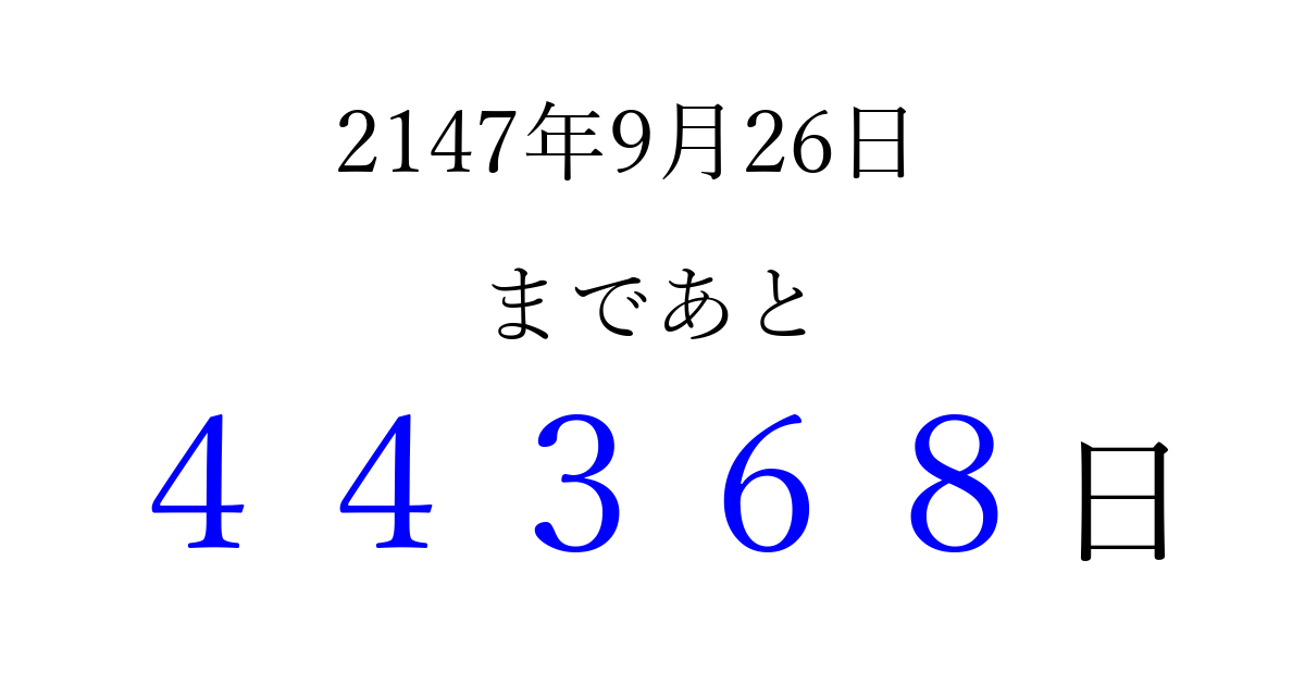 2147年9月26日(火)まで あと 99999 日です 追加すると、トップページからすぐ選べるようになります ※2026/04/05現在の結果です。 最新の状態に更新する ↓シェアして、タイムライン上にカウントダウンを表示しよう!↓ 📤 この結果を共有する Tweet シェア Threads Bluesky 別の日付でカウントダウン 2147年9月のカレンダー このページをブックマークに追加すると、いつでもカウントダウンを確認できます。 (PC: Ctrl+D / Mac: ⌘+D) hitome-notes.comでは以下のページも運営しています。 指定日と期間から日付を計算 | ガチャ確率計算・シミュレーション | プライバシー・ポリシー 運営者:Avocado
