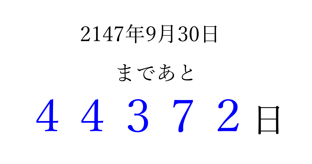 2147年9月30日(土)まで あと 99999 日です 追加すると、トップページからすぐ選べるようになります ※2026/04/05現在の結果です。 最新の状態に更新する ↓シェアして、タイムライン上にカウントダウンを表示しよう!↓ 📤 この結果を共有する Tweet シェア Threads Bluesky 別の日付でカウントダウン 2147年9月のカレンダー このページをブックマークに追加すると、いつでもカウントダウンを確認できます。 (PC: Ctrl+D / Mac: ⌘+D) hitome-notes.comでは以下のページも運営しています。 指定日と期間から日付を計算 | ガチャ確率計算・シミュレーション | プライバシー・ポリシー 運営者:Avocado
