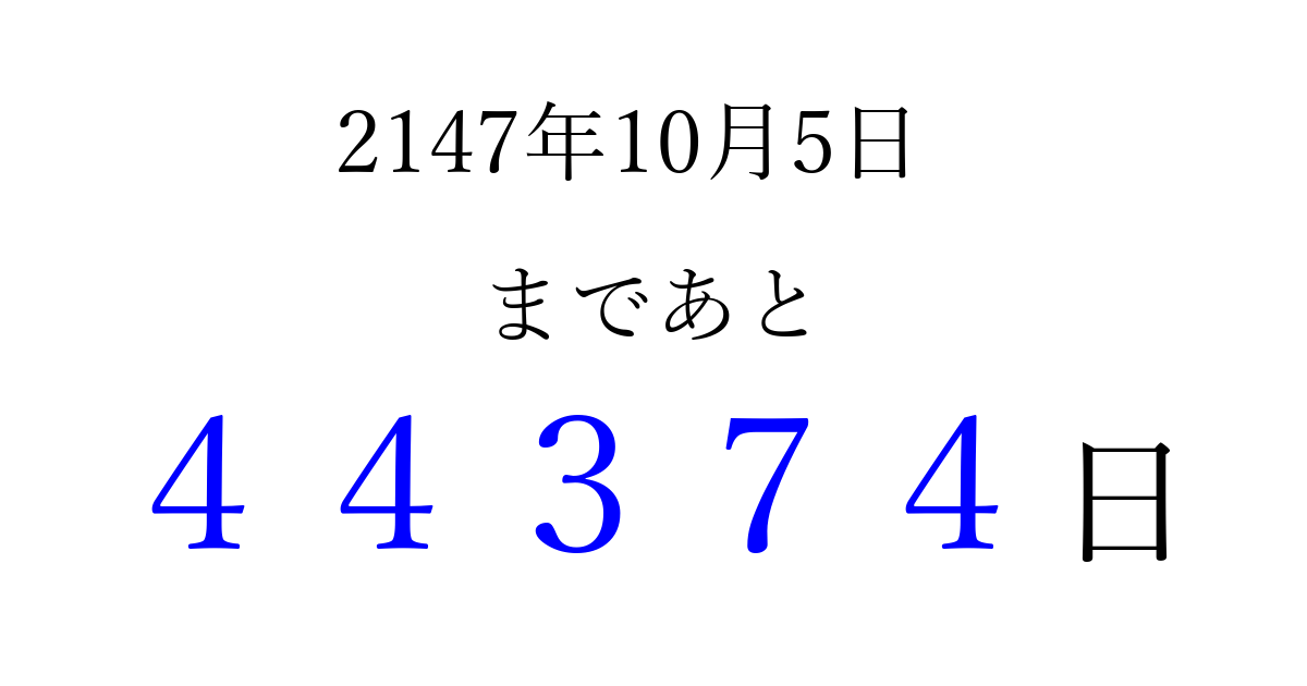 2147年10月5日(木)まで あと 99999 日です 追加すると、トップページからすぐ選べるようになります ※2026/04/08現在の結果です。 最新の状態に更新する ↓シェアして、タイムライン上にカウントダウンを表示しよう!↓ 📤 この結果を共有する Tweet シェア Threads Bluesky 別の日付でカウントダウン 2147年10月のカレンダー このページをブックマークに追加すると、いつでもカウントダウンを確認できます。 (PC: Ctrl+D / Mac: ⌘+D) hitome-notes.comでは以下のページも運営しています。 指定日と期間から日付を計算 | ガチャ確率計算・シミュレーション | プライバシー・ポリシー 運営者:Avocado