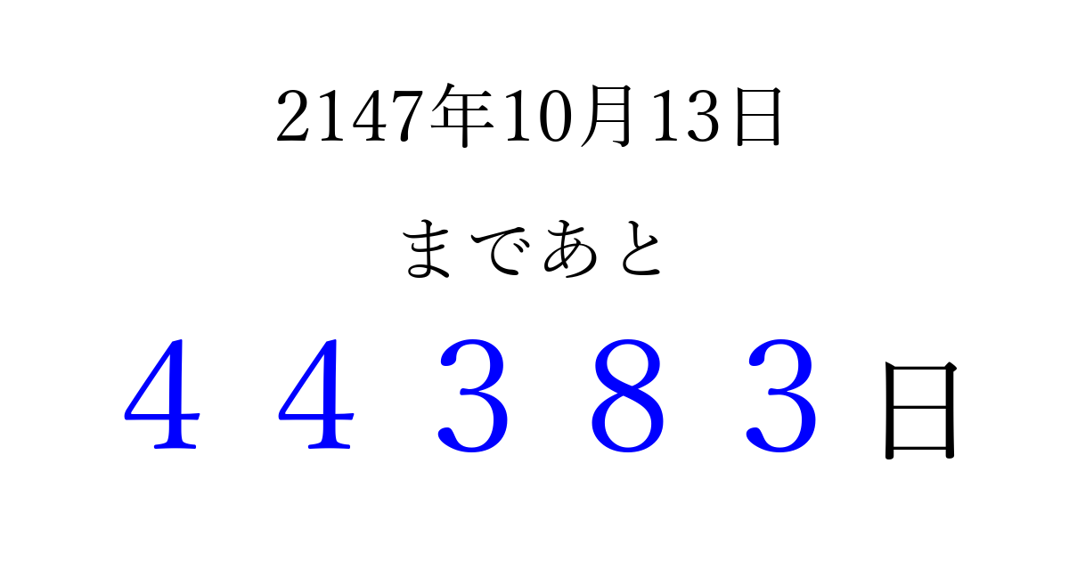 2147年10月13日(金)まで あと 99999 日です 追加すると、トップページからすぐ選べるようになります ※2026/04/07現在の結果です。 最新の状態に更新する ↓シェアして、タイムライン上にカウントダウンを表示しよう!↓ 📤 この結果を共有する Tweet シェア Threads Bluesky 別の日付でカウントダウン 2147年10月のカレンダー このページをブックマークに追加すると、いつでもカウントダウンを確認できます。 (PC: Ctrl+D / Mac: ⌘+D) hitome-notes.comでは以下のページも運営しています。 指定日と期間から日付を計算 | ガチャ確率計算・シミュレーション | プライバシー・ポリシー 運営者:Avocado