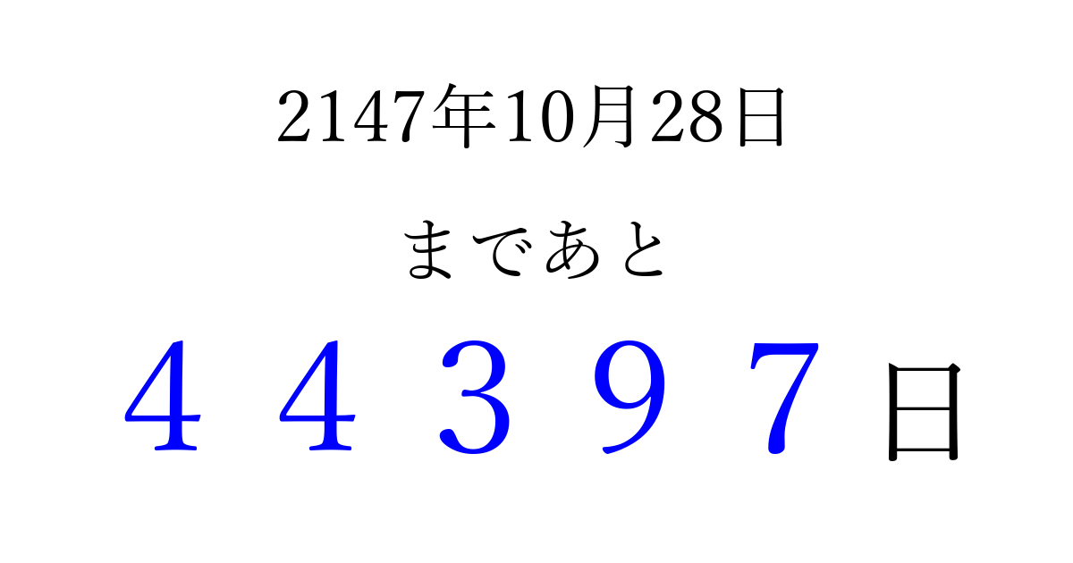 2147年10月28日(土)まで あと 99999 日です 追加すると、トップページからすぐ選べるようになります ※2026/04/08現在の結果です。 最新の状態に更新する ↓シェアして、タイムライン上にカウントダウンを表示しよう!↓ 📤 この結果を共有する Tweet シェア Threads Bluesky 別の日付でカウントダウン 2147年10月のカレンダー このページをブックマークに追加すると、いつでもカウントダウンを確認できます。 (PC: Ctrl+D / Mac: ⌘+D) hitome-notes.comでは以下のページも運営しています。 指定日と期間から日付を計算 | ガチャ確率計算・シミュレーション | プライバシー・ポリシー 運営者:Avocado
