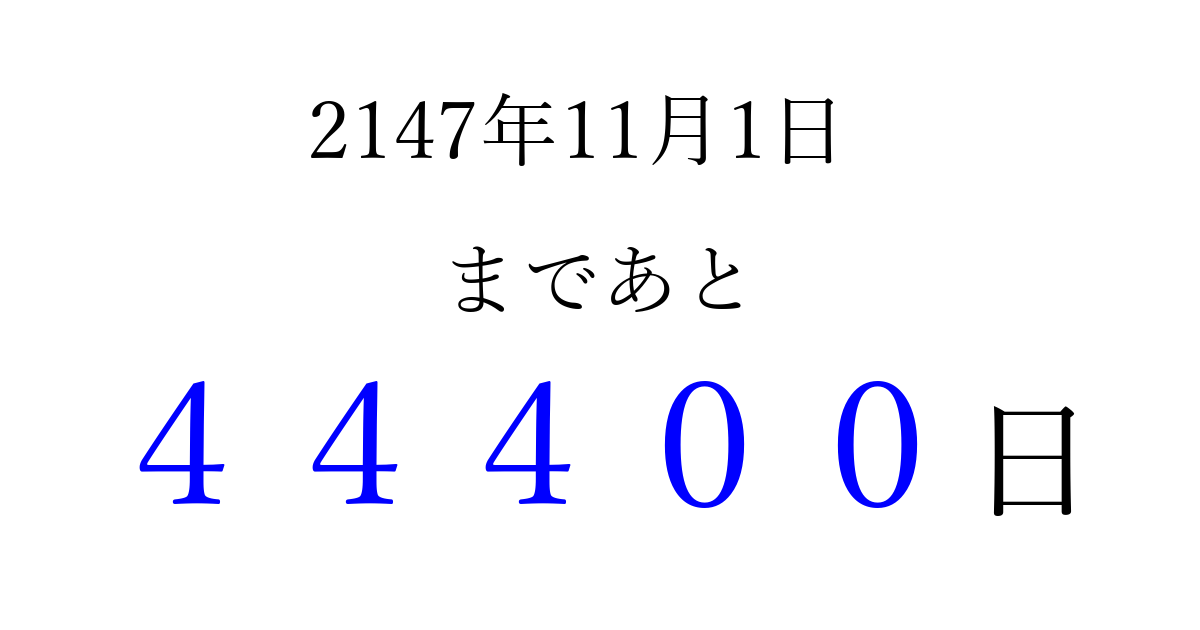 2147年11月1日(水)まで あと 99999 日です 追加すると、トップページからすぐ選べるようになります ※2026/04/09現在の結果です。 最新の状態に更新する ↓シェアして、タイムライン上にカウントダウンを表示しよう!↓ 📤 この結果を共有する Tweet シェア Threads Bluesky 別の日付でカウントダウン 2147年11月のカレンダー このページをブックマークに追加すると、いつでもカウントダウンを確認できます。 (PC: Ctrl+D / Mac: ⌘+D) hitome-notes.comでは以下のページも運営しています。 指定日と期間から日付を計算 | ガチャ確率計算・シミュレーション | プライバシー・ポリシー 運営者:Avocado
