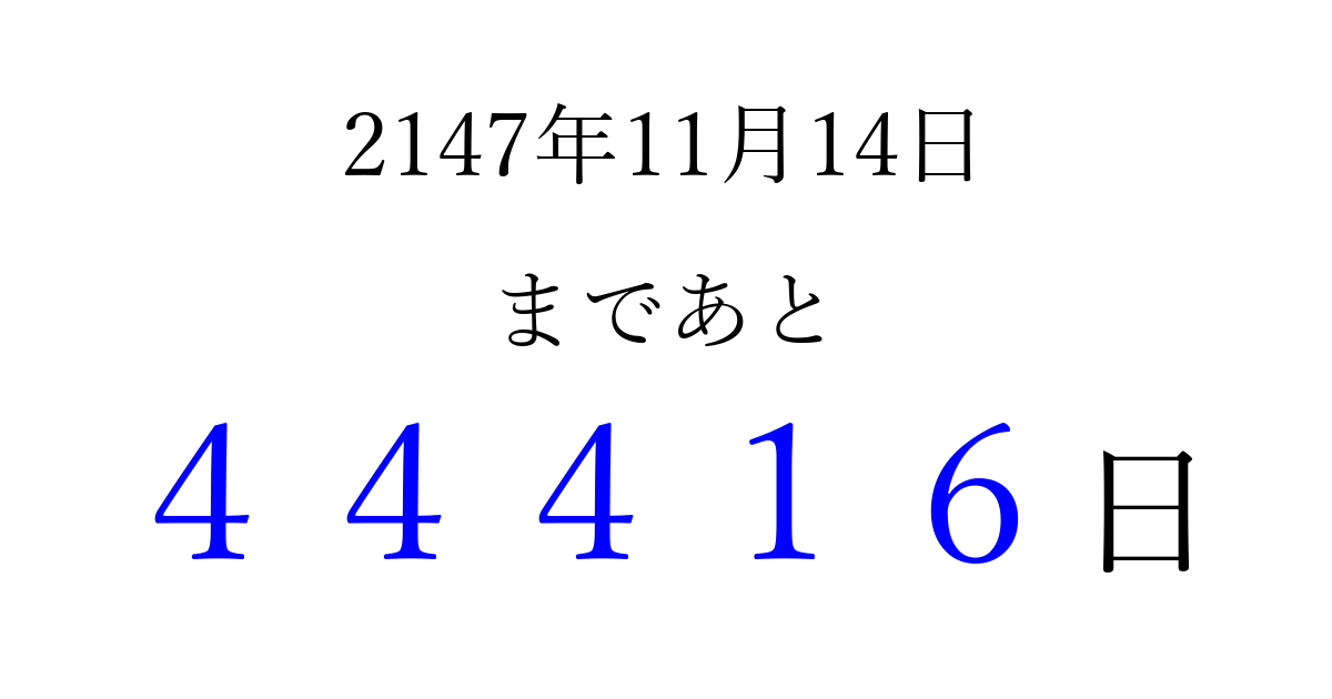 2147年11月14日(火)まで あと 99999 日です 追加すると、トップページからすぐ選べるようになります ※2026/04/06現在の結果です。 最新の状態に更新する ↓シェアして、タイムライン上にカウントダウンを表示しよう!↓ 📤 この結果を共有する Tweet シェア Threads Bluesky 別の日付でカウントダウン 2147年11月のカレンダー このページをブックマークに追加すると、いつでもカウントダウンを確認できます。 (PC: Ctrl+D / Mac: ⌘+D) hitome-notes.comでは以下のページも運営しています。 指定日と期間から日付を計算 | ガチャ確率計算・シミュレーション | プライバシー・ポリシー 運営者:Avocado