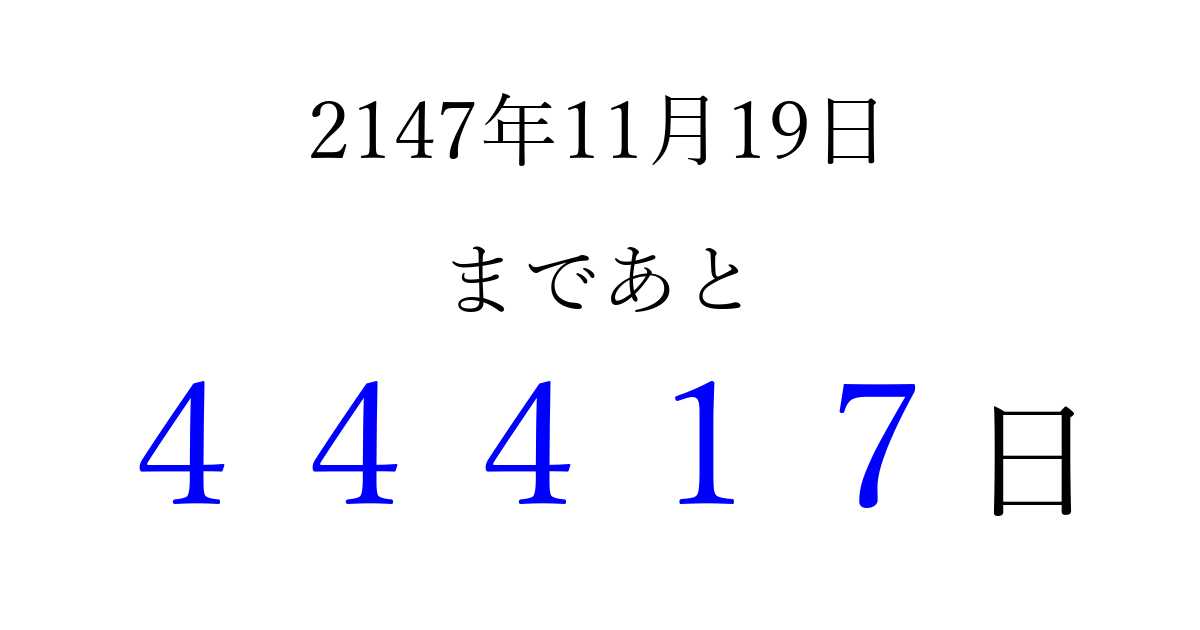 2147年11月19日(日)まで あと 99999 日です 追加すると、トップページからすぐ選べるようになります ※2026/04/10現在の結果です。 最新の状態に更新する ↓シェアして、タイムライン上にカウントダウンを表示しよう!↓ 📤 この結果を共有する Tweet シェア Threads Bluesky 別の日付でカウントダウン 2147年11月のカレンダー このページをブックマークに追加すると、いつでもカウントダウンを確認できます。 (PC: Ctrl+D / Mac: ⌘+D) hitome-notes.comでは以下のページも運営しています。 指定日と期間から日付を計算 | ガチャ確率計算・シミュレーション | プライバシー・ポリシー 運営者:Avocado
