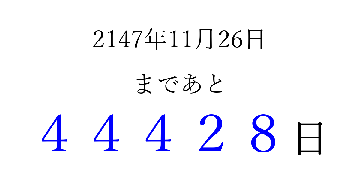 2147年11月26日(日)まで あと 99999 日です 追加すると、トップページからすぐ選べるようになります ※2026/04/06現在の結果です。 最新の状態に更新する ↓シェアして、タイムライン上にカウントダウンを表示しよう!↓ 📤 この結果を共有する Tweet シェア Threads Bluesky 別の日付でカウントダウン 2147年11月のカレンダー このページをブックマークに追加すると、いつでもカウントダウンを確認できます。 (PC: Ctrl+D / Mac: ⌘+D) hitome-notes.comでは以下のページも運営しています。 指定日と期間から日付を計算 | ガチャ確率計算・シミュレーション | プライバシー・ポリシー 運営者:Avocado