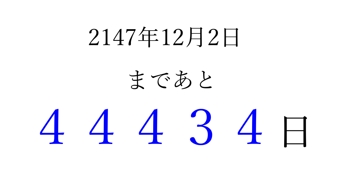 2147年12月2日(土)まで あと 99999 日です 追加すると、トップページからすぐ選べるようになります ※2026/04/06現在の結果です。 最新の状態に更新する ↓シェアして、タイムライン上にカウントダウンを表示しよう!↓ 📤 この結果を共有する Tweet シェア Threads Bluesky 別の日付でカウントダウン 2147年12月のカレンダー このページをブックマークに追加すると、いつでもカウントダウンを確認できます。 (PC: Ctrl+D / Mac: ⌘+D) hitome-notes.comでは以下のページも運営しています。 指定日と期間から日付を計算 | ガチャ確率計算・シミュレーション | プライバシー・ポリシー 運営者:Avocado