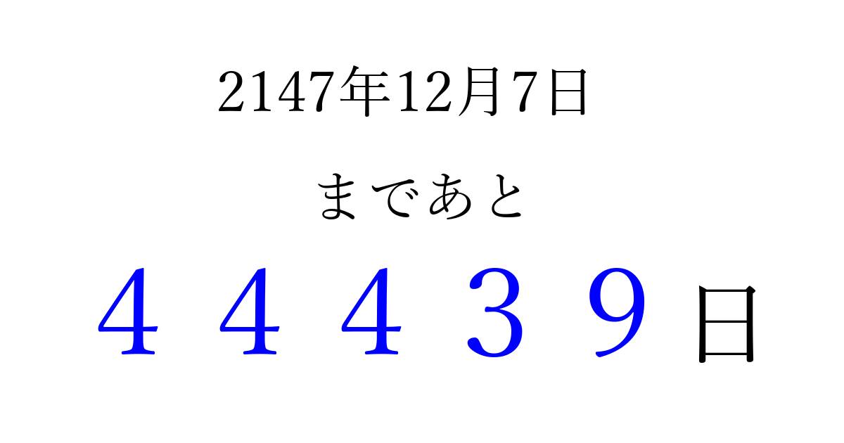2147年12月7日(木)まで あと 99999 日です 追加すると、トップページからすぐ選べるようになります ※2026/04/06現在の結果です。 最新の状態に更新する ↓シェアして、タイムライン上にカウントダウンを表示しよう!↓ 📤 この結果を共有する Tweet シェア Threads Bluesky 別の日付でカウントダウン 2147年12月のカレンダー このページをブックマークに追加すると、いつでもカウントダウンを確認できます。 (PC: Ctrl+D / Mac: ⌘+D) hitome-notes.comでは以下のページも運営しています。 指定日と期間から日付を計算 | ガチャ確率計算・シミュレーション | プライバシー・ポリシー 運営者:Avocado