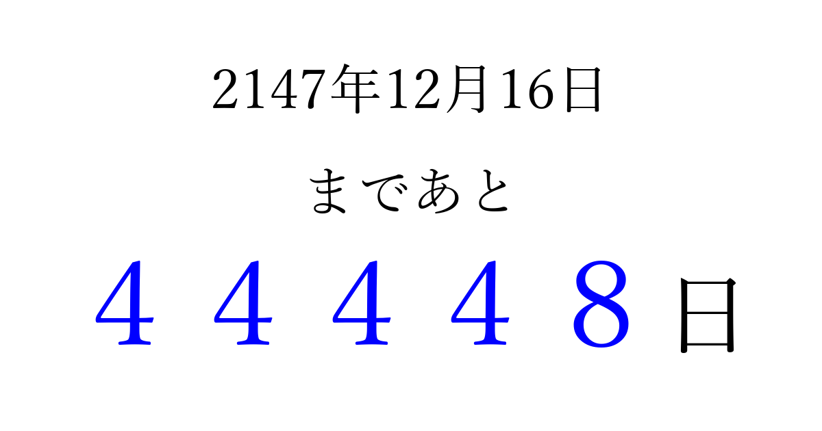 2147年12月16日(土)まで あと 99999 日です 追加すると、トップページからすぐ選べるようになります ※2026/04/06現在の結果です。 最新の状態に更新する ↓シェアして、タイムライン上にカウントダウンを表示しよう!↓ 📤 この結果を共有する Tweet シェア Threads Bluesky 別の日付でカウントダウン 2147年12月のカレンダー このページをブックマークに追加すると、いつでもカウントダウンを確認できます。 (PC: Ctrl+D / Mac: ⌘+D) hitome-notes.comでは以下のページも運営しています。 指定日と期間から日付を計算 | ガチャ確率計算・シミュレーション | プライバシー・ポリシー 運営者:Avocado