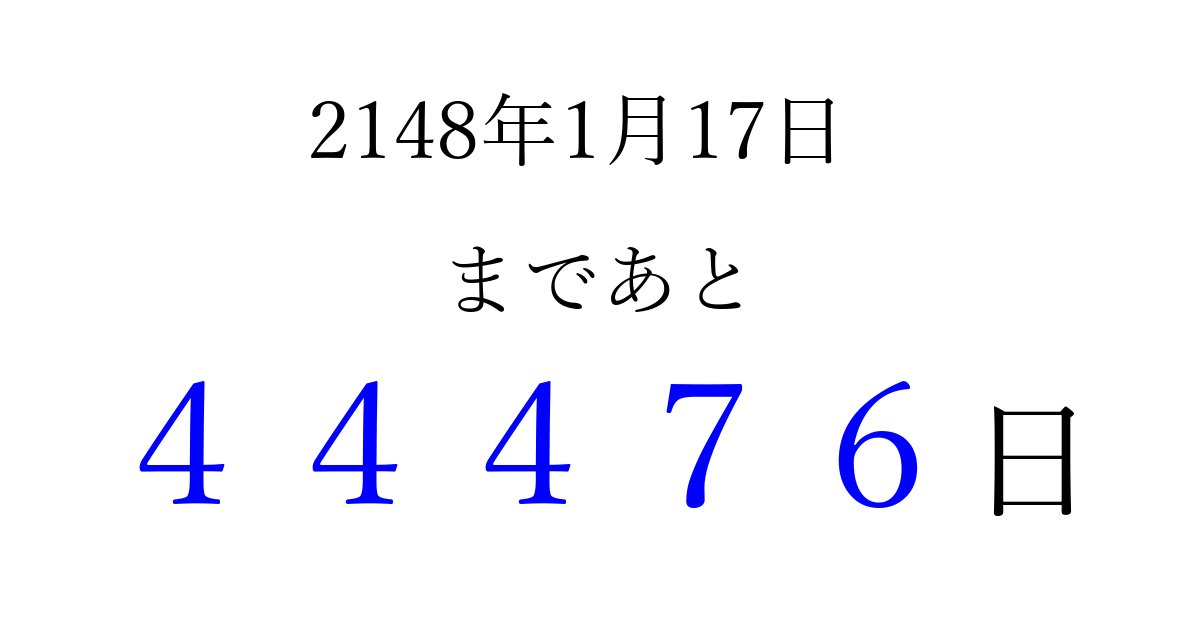2148年1月17日(水)まで あと 99999 日です 追加すると、トップページからすぐ選べるようになります ※2026/04/10現在の結果です。 最新の状態に更新する ↓シェアして、タイムライン上にカウントダウンを表示しよう!↓ 📤 この結果を共有する Tweet シェア Threads Bluesky 別の日付でカウントダウン 2148年1月のカレンダー このページをブックマークに追加すると、いつでもカウントダウンを確認できます。 (PC: Ctrl+D / Mac: ⌘+D) hitome-notes.comでは以下のページも運営しています。 指定日と期間から日付を計算 | ガチャ確率計算・シミュレーション | プライバシー・ポリシー 運営者:Avocado
