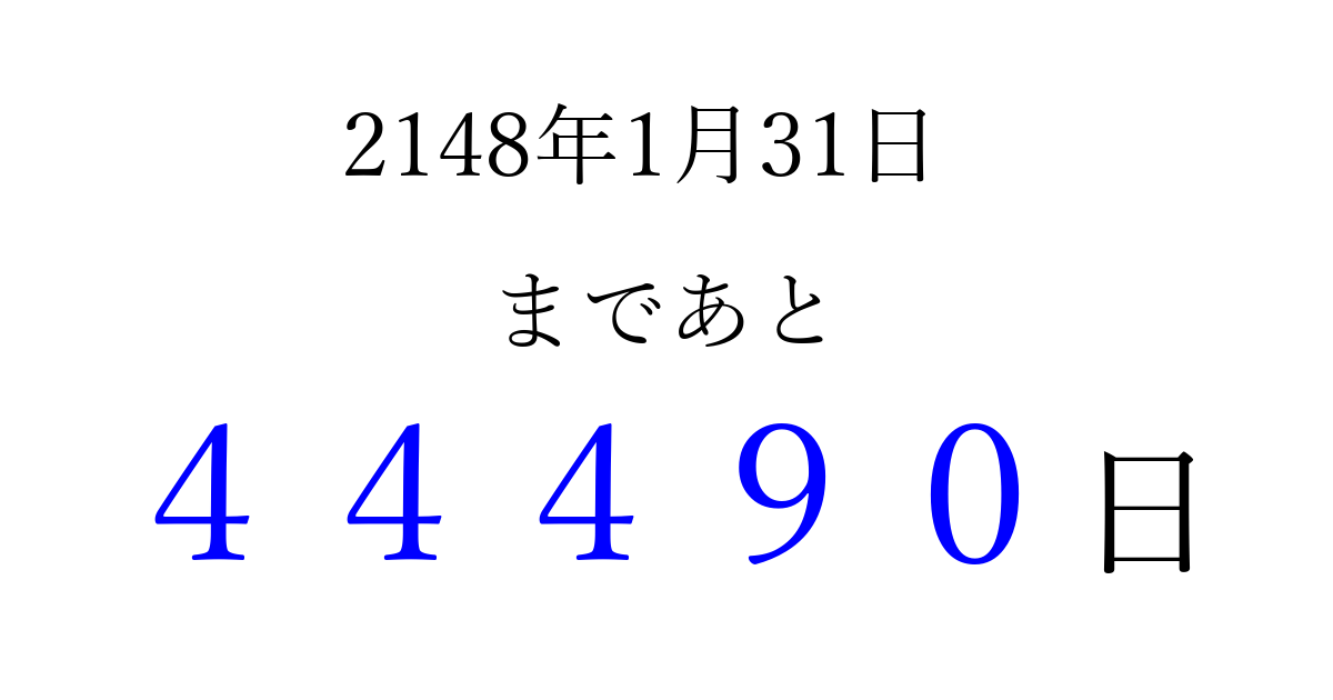 2148年1月31日(水)まで あと 99999 日です 追加すると、トップページからすぐ選べるようになります ※2026/04/10現在の結果です。 最新の状態に更新する ↓シェアして、タイムライン上にカウントダウンを表示しよう!↓ 📤 この結果を共有する Tweet シェア Threads Bluesky 別の日付でカウントダウン 2148年1月のカレンダー このページをブックマークに追加すると、いつでもカウントダウンを確認できます。 (PC: Ctrl+D / Mac: ⌘+D) hitome-notes.comでは以下のページも運営しています。 指定日と期間から日付を計算 | ガチャ確率計算・シミュレーション | プライバシー・ポリシー 運営者:Avocado