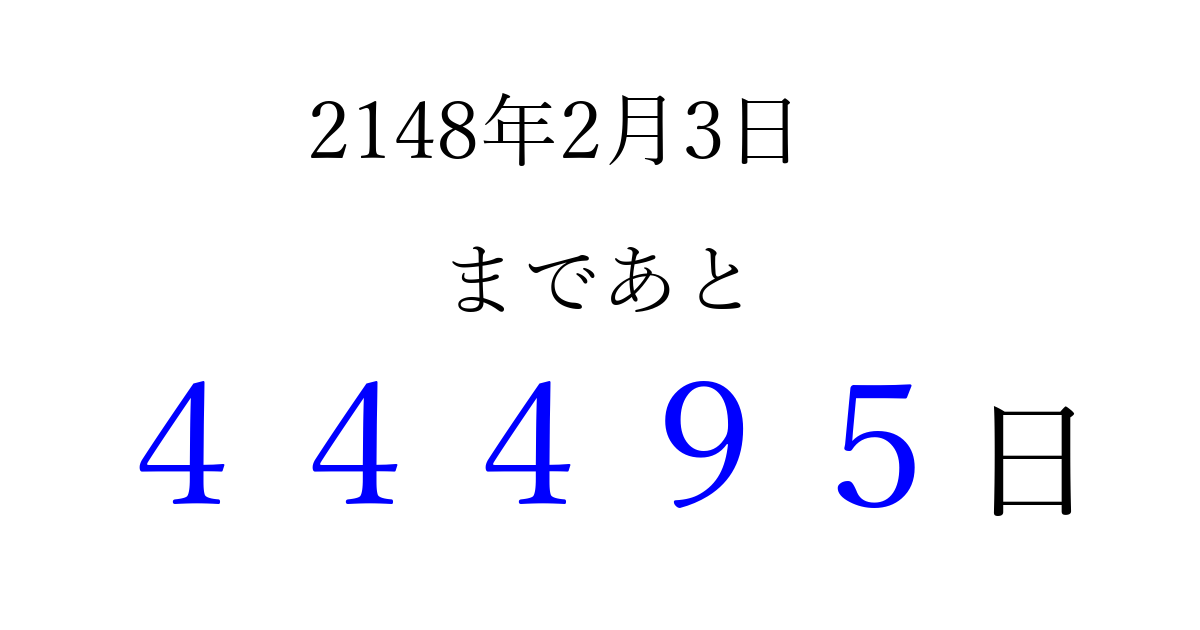 2148年2月3日(土)まで あと 99999 日です 追加すると、トップページからすぐ選べるようになります ※2026/04/08現在の結果です。 最新の状態に更新する ↓シェアして、タイムライン上にカウントダウンを表示しよう!↓ 📤 この結果を共有する Tweet シェア Threads Bluesky 別の日付でカウントダウン 2148年2月のカレンダー このページをブックマークに追加すると、いつでもカウントダウンを確認できます。 (PC: Ctrl+D / Mac: ⌘+D) hitome-notes.comでは以下のページも運営しています。 指定日と期間から日付を計算 | ガチャ確率計算・シミュレーション | プライバシー・ポリシー 運営者:Avocado