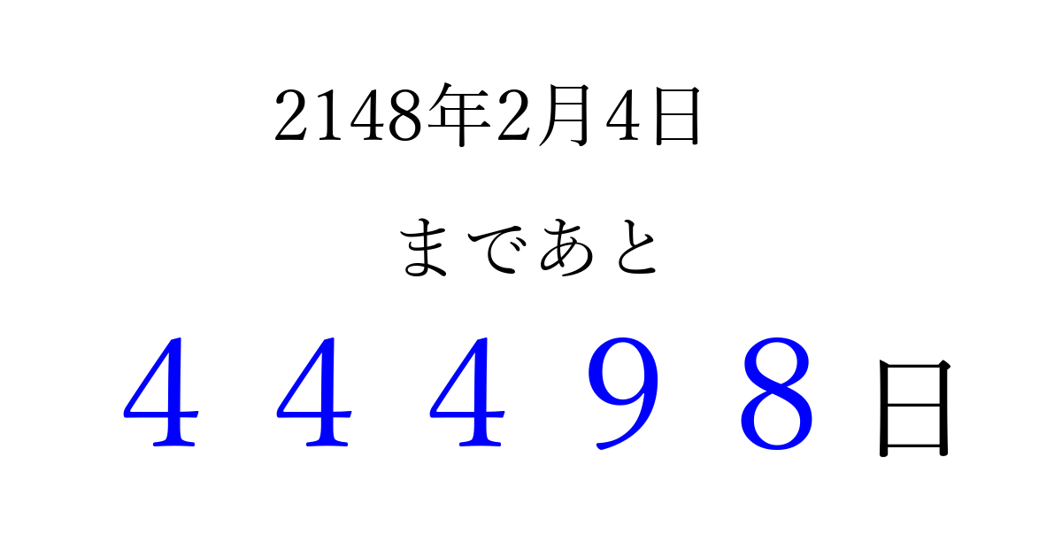 2148年2月4日(日)まで あと 99999 日です 追加すると、トップページからすぐ選べるようになります ※2026/04/06現在の結果です。 最新の状態に更新する ↓シェアして、タイムライン上にカウントダウンを表示しよう!↓ 📤 この結果を共有する Tweet シェア Threads Bluesky 別の日付でカウントダウン 2148年2月のカレンダー このページをブックマークに追加すると、いつでもカウントダウンを確認できます。 (PC: Ctrl+D / Mac: ⌘+D) hitome-notes.comでは以下のページも運営しています。 指定日と期間から日付を計算 | ガチャ確率計算・シミュレーション | プライバシー・ポリシー 運営者:Avocado