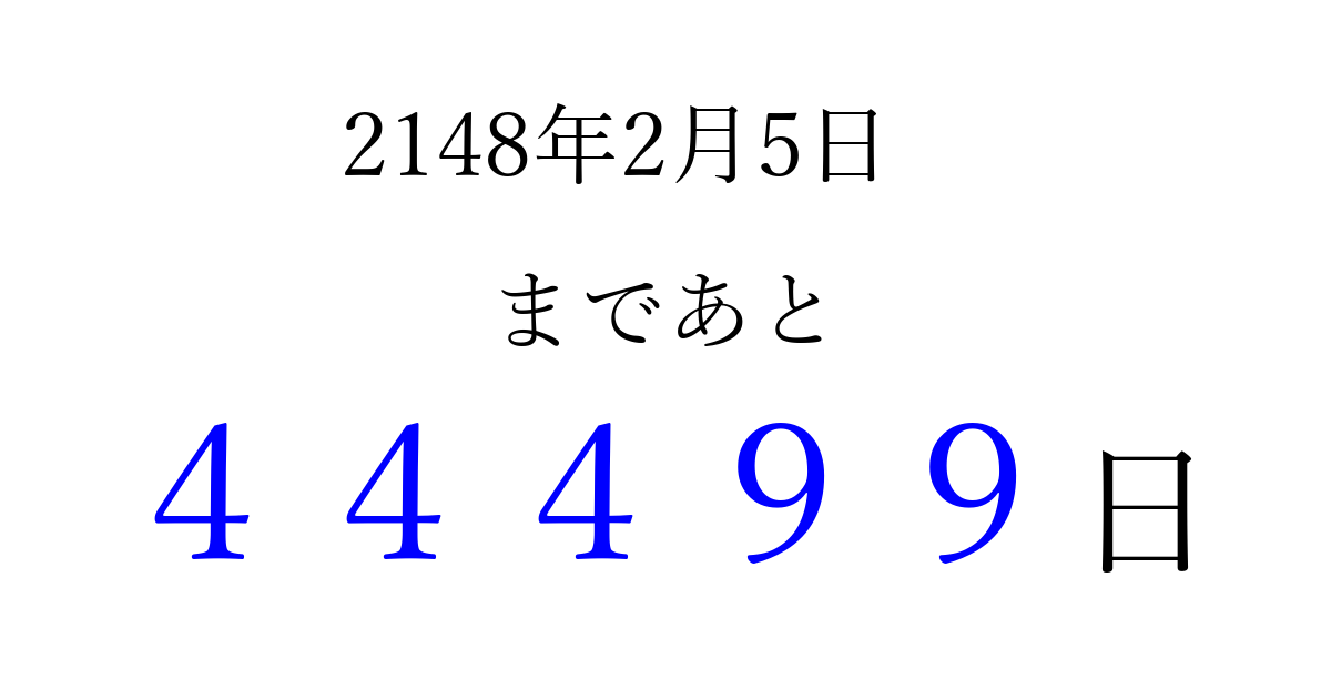 2148年2月5日(月)まで あと 99999 日です 追加すると、トップページからすぐ選べるようになります ※2026/04/06現在の結果です。 最新の状態に更新する ↓シェアして、タイムライン上にカウントダウンを表示しよう!↓ 📤 この結果を共有する Tweet シェア Threads Bluesky 別の日付でカウントダウン 2148年2月のカレンダー このページをブックマークに追加すると、いつでもカウントダウンを確認できます。 (PC: Ctrl+D / Mac: ⌘+D) hitome-notes.comでは以下のページも運営しています。 指定日と期間から日付を計算 | ガチャ確率計算・シミュレーション | プライバシー・ポリシー 運営者:Avocado