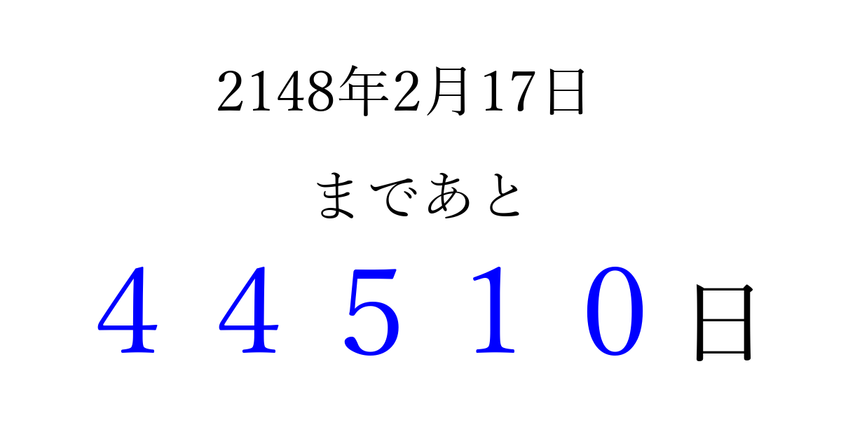 2148年2月17日(土)まで あと 99999 日です 追加すると、トップページからすぐ選べるようになります ※2026/04/07現在の結果です。 最新の状態に更新する ↓シェアして、タイムライン上にカウントダウンを表示しよう!↓ 📤 この結果を共有する Tweet シェア Threads Bluesky 別の日付でカウントダウン 2148年2月のカレンダー このページをブックマークに追加すると、いつでもカウントダウンを確認できます。 (PC: Ctrl+D / Mac: ⌘+D) hitome-notes.comでは以下のページも運営しています。 指定日と期間から日付を計算 | ガチャ確率計算・シミュレーション | プライバシー・ポリシー 運営者:Avocado