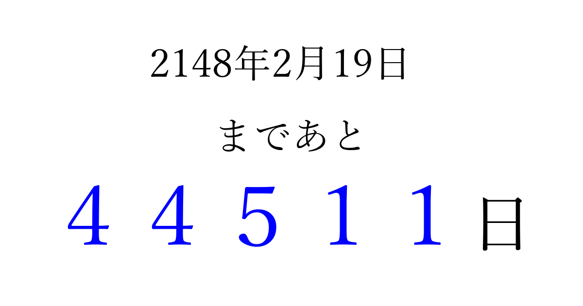 2148年2月19日(月)まで あと 99999 日です 追加すると、トップページからすぐ選べるようになります ※2026/04/08現在の結果です。 最新の状態に更新する ↓シェアして、タイムライン上にカウントダウンを表示しよう!↓ 📤 この結果を共有する Tweet シェア Threads Bluesky 別の日付でカウントダウン 2148年2月のカレンダー このページをブックマークに追加すると、いつでもカウントダウンを確認できます。 (PC: Ctrl+D / Mac: ⌘+D) hitome-notes.comでは以下のページも運営しています。 指定日と期間から日付を計算 | ガチャ確率計算・シミュレーション | プライバシー・ポリシー 運営者:Avocado