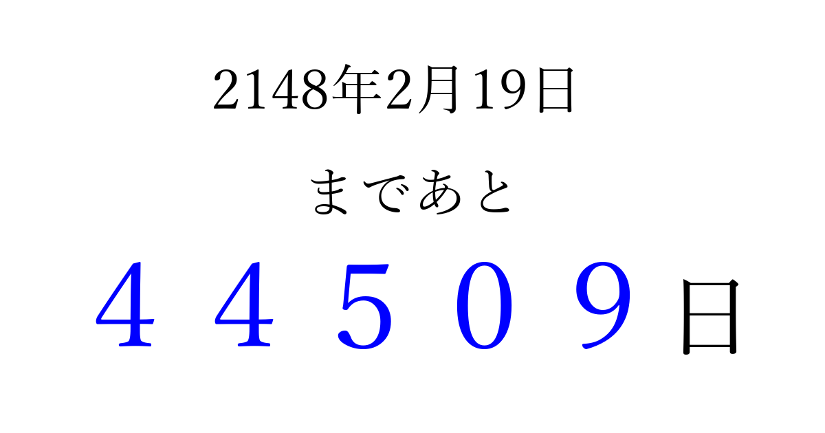 2148年2月19日(月)まで あと 99999 日です 追加すると、トップページからすぐ選べるようになります ※2026/04/10現在の結果です。 最新の状態に更新する ↓シェアして、タイムライン上にカウントダウンを表示しよう!↓ 📤 この結果を共有する Tweet シェア Threads Bluesky 別の日付でカウントダウン 2148年2月のカレンダー このページをブックマークに追加すると、いつでもカウントダウンを確認できます。 (PC: Ctrl+D / Mac: ⌘+D) hitome-notes.comでは以下のページも運営しています。 指定日と期間から日付を計算 | ガチャ確率計算・シミュレーション | プライバシー・ポリシー 運営者:Avocado