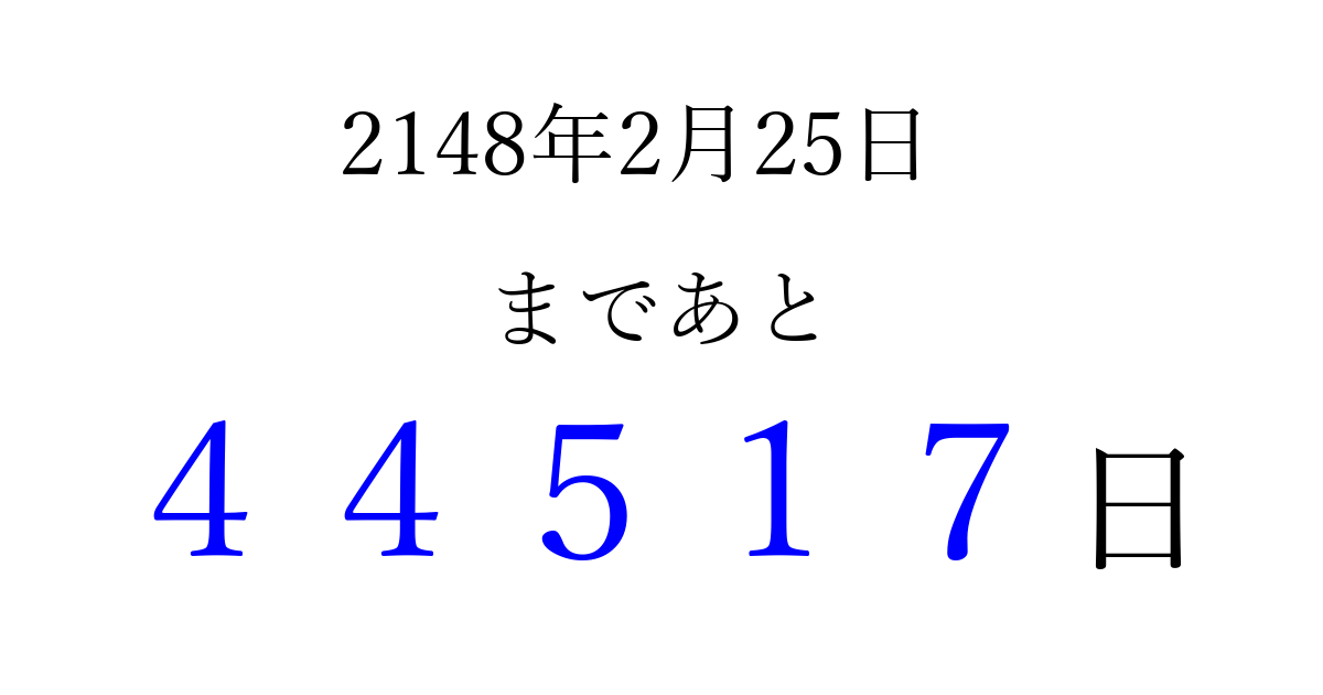2148年2月25日(日)まで あと 99999 日です 追加すると、トップページからすぐ選べるようになります ※2026/04/08現在の結果です。 最新の状態に更新する ↓シェアして、タイムライン上にカウントダウンを表示しよう!↓ 📤 この結果を共有する Tweet シェア Threads Bluesky 別の日付でカウントダウン 2148年2月のカレンダー このページをブックマークに追加すると、いつでもカウントダウンを確認できます。 (PC: Ctrl+D / Mac: ⌘+D) hitome-notes.comでは以下のページも運営しています。 指定日と期間から日付を計算 | ガチャ確率計算・シミュレーション | プライバシー・ポリシー 運営者:Avocado