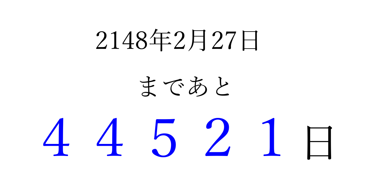 2148年2月27日(火)まで あと 99999 日です 追加すると、トップページからすぐ選べるようになります ※2026/04/06現在の結果です。 最新の状態に更新する ↓シェアして、タイムライン上にカウントダウンを表示しよう!↓ 📤 この結果を共有する Tweet シェア Threads Bluesky 別の日付でカウントダウン 2148年2月のカレンダー このページをブックマークに追加すると、いつでもカウントダウンを確認できます。 (PC: Ctrl+D / Mac: ⌘+D) hitome-notes.comでは以下のページも運営しています。 指定日と期間から日付を計算 | ガチャ確率計算・シミュレーション | プライバシー・ポリシー 運営者:Avocado