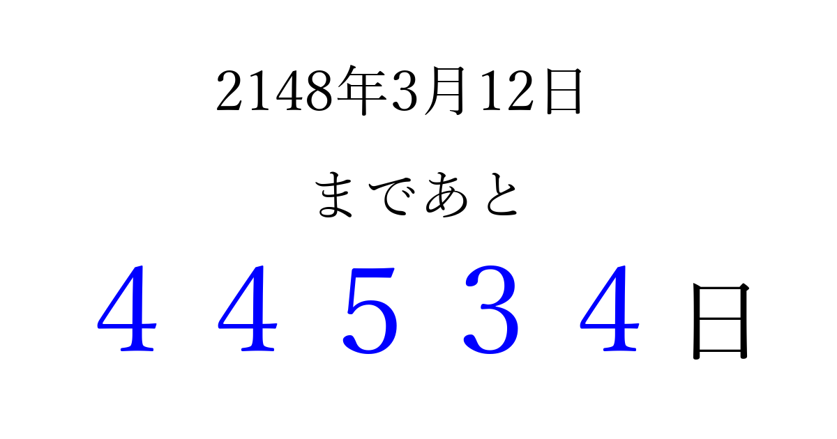 2148年3月12日(火)まで あと 99999 日です 追加すると、トップページからすぐ選べるようになります ※2026/04/07現在の結果です。 最新の状態に更新する ↓シェアして、タイムライン上にカウントダウンを表示しよう!↓ 📤 この結果を共有する Tweet シェア Threads Bluesky 別の日付でカウントダウン 2148年3月のカレンダー このページをブックマークに追加すると、いつでもカウントダウンを確認できます。 (PC: Ctrl+D / Mac: ⌘+D) hitome-notes.comでは以下のページも運営しています。 指定日と期間から日付を計算 | ガチャ確率計算・シミュレーション | プライバシー・ポリシー 運営者:Avocado