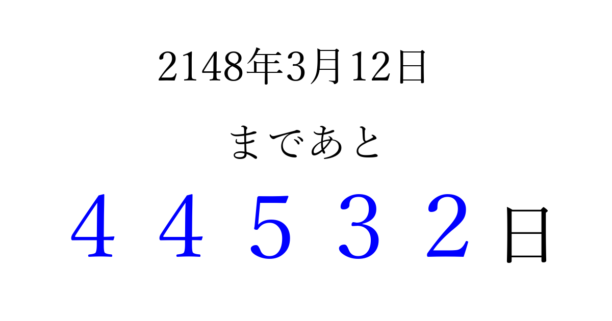 2148年3月12日(火)まで あと 99999 日です 追加すると、トップページからすぐ選べるようになります ※2026/04/09現在の結果です。 最新の状態に更新する ↓シェアして、タイムライン上にカウントダウンを表示しよう!↓ 📤 この結果を共有する Tweet シェア Threads Bluesky 別の日付でカウントダウン 2148年3月のカレンダー このページをブックマークに追加すると、いつでもカウントダウンを確認できます。 (PC: Ctrl+D / Mac: ⌘+D) hitome-notes.comでは以下のページも運営しています。 指定日と期間から日付を計算 | ガチャ確率計算・シミュレーション | プライバシー・ポリシー 運営者:Avocado