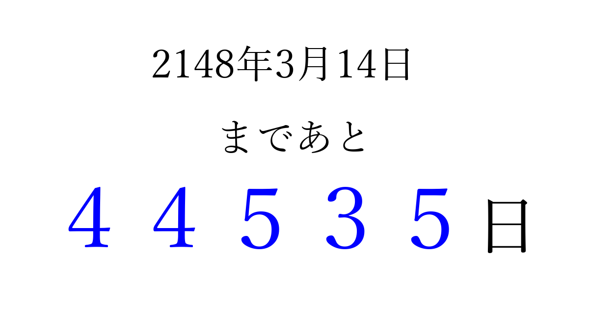 2148年3月14日(木)まで あと 99999 日です 追加すると、トップページからすぐ選べるようになります ※2026/04/08現在の結果です。 最新の状態に更新する ↓シェアして、タイムライン上にカウントダウンを表示しよう!↓ 📤 この結果を共有する Tweet シェア Threads Bluesky 別の日付でカウントダウン 2148年3月のカレンダー このページをブックマークに追加すると、いつでもカウントダウンを確認できます。 (PC: Ctrl+D / Mac: ⌘+D) hitome-notes.comでは以下のページも運営しています。 指定日と期間から日付を計算 | ガチャ確率計算・シミュレーション | プライバシー・ポリシー 運営者:Avocado