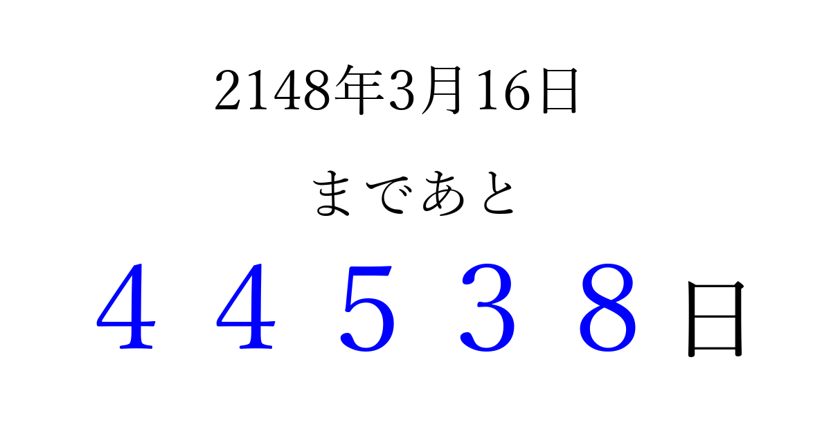 2148年3月16日(土)まで あと 99999 日です 追加すると、トップページからすぐ選べるようになります ※2026/04/07現在の結果です。 最新の状態に更新する ↓シェアして、タイムライン上にカウントダウンを表示しよう!↓ 📤 この結果を共有する Tweet シェア Threads Bluesky 別の日付でカウントダウン 2148年3月のカレンダー このページをブックマークに追加すると、いつでもカウントダウンを確認できます。 (PC: Ctrl+D / Mac: ⌘+D) hitome-notes.comでは以下のページも運営しています。 指定日と期間から日付を計算 | ガチャ確率計算・シミュレーション | プライバシー・ポリシー 運営者:Avocado