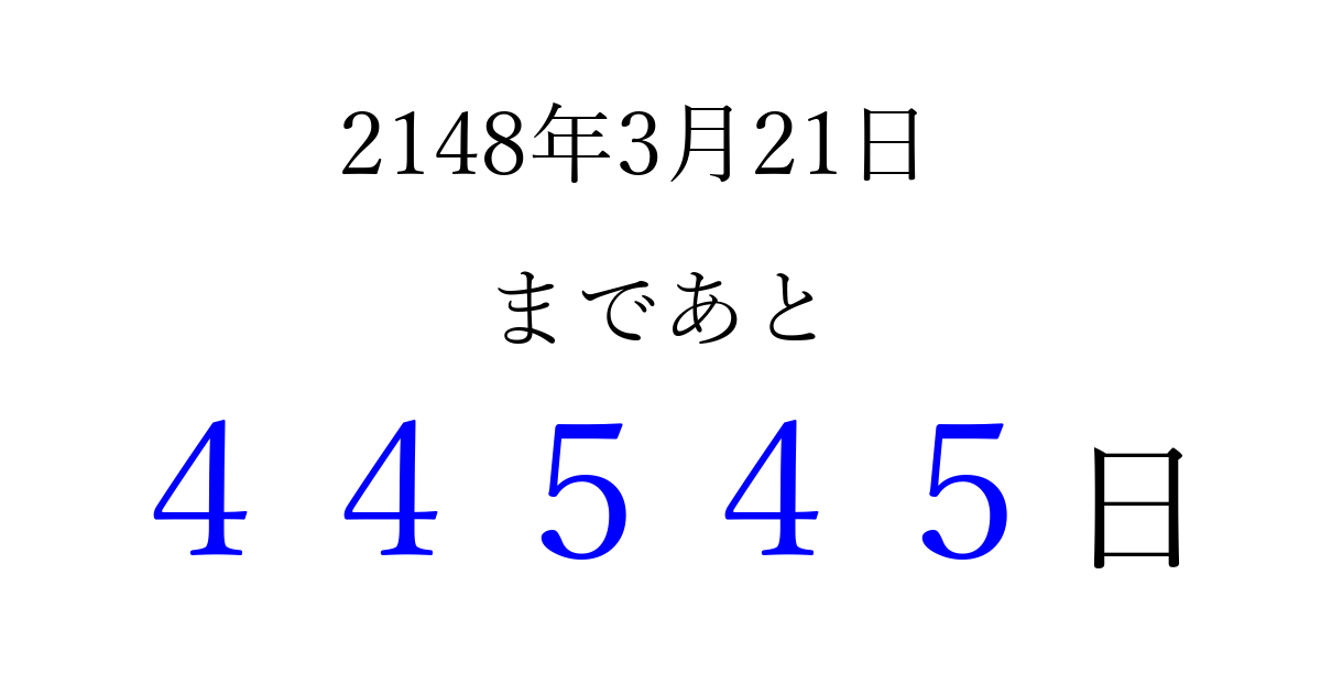 2148年3月21日(木)まで あと 99999 日です 追加すると、トップページからすぐ選べるようになります ※2026/04/05現在の結果です。 最新の状態に更新する ↓シェアして、タイムライン上にカウントダウンを表示しよう!↓ 📤 この結果を共有する Tweet シェア Threads Bluesky 別の日付でカウントダウン 2148年3月のカレンダー このページをブックマークに追加すると、いつでもカウントダウンを確認できます。 (PC: Ctrl+D / Mac: ⌘+D) hitome-notes.comでは以下のページも運営しています。 指定日と期間から日付を計算 | ガチャ確率計算・シミュレーション | プライバシー・ポリシー 運営者:Avocado