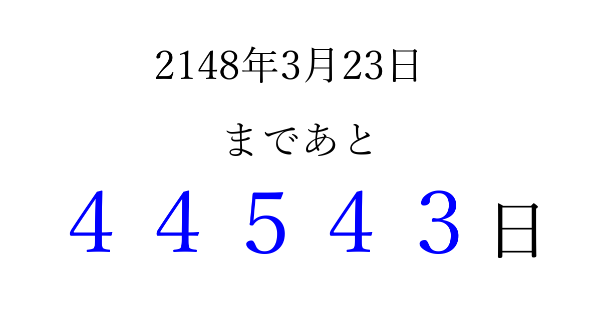 2148年3月23日(土)まで あと 99999 日です 追加すると、トップページからすぐ選べるようになります ※2026/04/09現在の結果です。 最新の状態に更新する ↓シェアして、タイムライン上にカウントダウンを表示しよう!↓ 📤 この結果を共有する Tweet シェア Threads Bluesky 別の日付でカウントダウン 2148年3月のカレンダー このページをブックマークに追加すると、いつでもカウントダウンを確認できます。 (PC: Ctrl+D / Mac: ⌘+D) hitome-notes.comでは以下のページも運営しています。 指定日と期間から日付を計算 | ガチャ確率計算・シミュレーション | プライバシー・ポリシー 運営者:Avocado