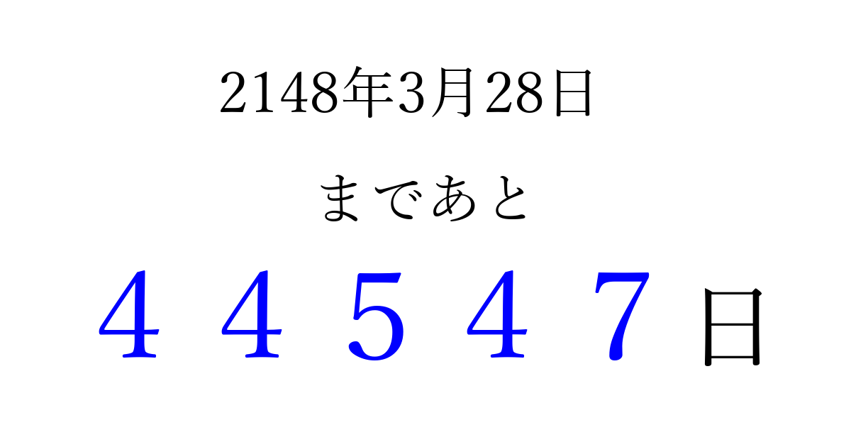 2148年3月28日(木)まで あと 99999 日です 追加すると、トップページからすぐ選べるようになります ※2026/04/10現在の結果です。 最新の状態に更新する ↓シェアして、タイムライン上にカウントダウンを表示しよう!↓ 📤 この結果を共有する Tweet シェア Threads Bluesky 別の日付でカウントダウン 2148年3月のカレンダー このページをブックマークに追加すると、いつでもカウントダウンを確認できます。 (PC: Ctrl+D / Mac: ⌘+D) hitome-notes.comでは以下のページも運営しています。 指定日と期間から日付を計算 | ガチャ確率計算・シミュレーション | プライバシー・ポリシー 運営者:Avocado