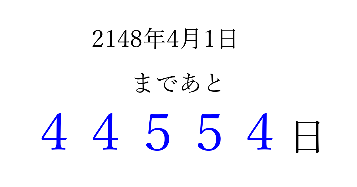 2148年4月1日(月)まで あと 99999 日です 追加すると、トップページからすぐ選べるようになります ※2026/04/07現在の結果です。 最新の状態に更新する ↓シェアして、タイムライン上にカウントダウンを表示しよう!↓ 📤 この結果を共有する Tweet シェア Threads Bluesky 別の日付でカウントダウン 2148年4月のカレンダー このページをブックマークに追加すると、いつでもカウントダウンを確認できます。 (PC: Ctrl+D / Mac: ⌘+D) hitome-notes.comでは以下のページも運営しています。 指定日と期間から日付を計算 | ガチャ確率計算・シミュレーション | プライバシー・ポリシー 運営者:Avocado