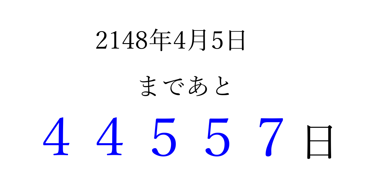 2148年4月5日(金)まで あと 99999 日です 追加すると、トップページからすぐ選べるようになります ※2026/04/08現在の結果です。 最新の状態に更新する ↓シェアして、タイムライン上にカウントダウンを表示しよう!↓ 📤 この結果を共有する Tweet シェア Threads Bluesky 別の日付でカウントダウン 2148年4月のカレンダー このページをブックマークに追加すると、いつでもカウントダウンを確認できます。 (PC: Ctrl+D / Mac: ⌘+D) hitome-notes.comでは以下のページも運営しています。 指定日と期間から日付を計算 | ガチャ確率計算・シミュレーション | プライバシー・ポリシー 運営者:Avocado